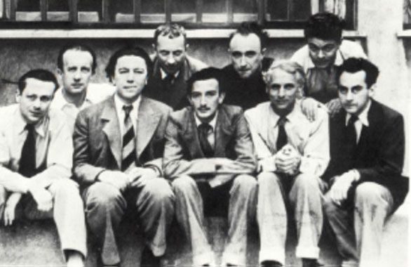 Le groupe surréaliste photographié chez Tristan Tzara vers 1930 ; on reconnait, de gauche à droite : Tristan Tzara, Paul Eluard, André Breton, Hans Arp, Salvador Dali, Yves Tanguy, Max Ernst, René Crevel et Man Ray.